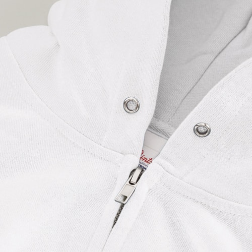 杢グレーのジップパーカーの背中に暖色のオレンジを使用して加工することにより、温かいイメージの出来上がりになっています。